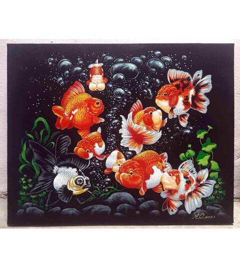 An acrylic painting of aquarium life written on canvas, it belongs to the brush of a remarkable Thai artist Krisanachai Sripila.