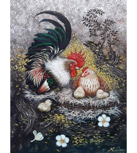A 40*50 cm acrylic painting of a chicken couple with little chicks written on canvas, it belongs to the brush of a remarkable Thai artist Krisanachai Sripila.