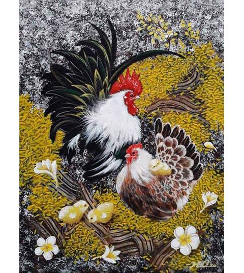A 40 * 50cm acrylic painting of a chicken couple with little chicks written on canvas, it belongs to the brush of a remarkable Thai artist Krisanachai Sripila.