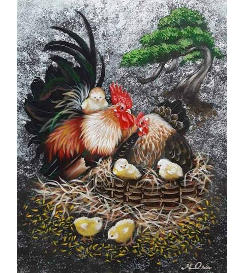 A 40 * 50 cm acrylic painting of a chicken couple with little chicks written on canvas, it belongs to the brush of a remarkable Thai artist Krisanachai Sripila.