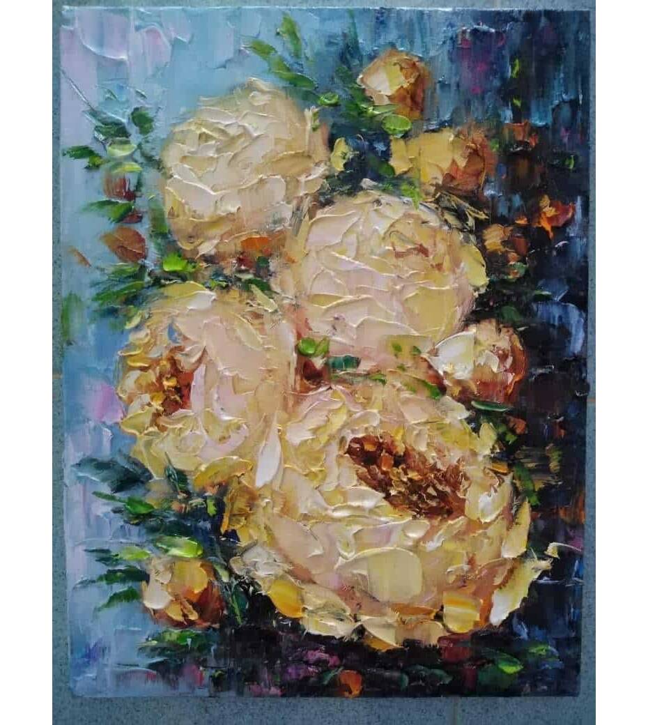 The work is so lively, that the viewer can almost feel the gentle flower scent and the softness of peony petals. The faint lighting of an early morning is shown through the dark shades of blue and green and the flowers’ slightly-beige tint.